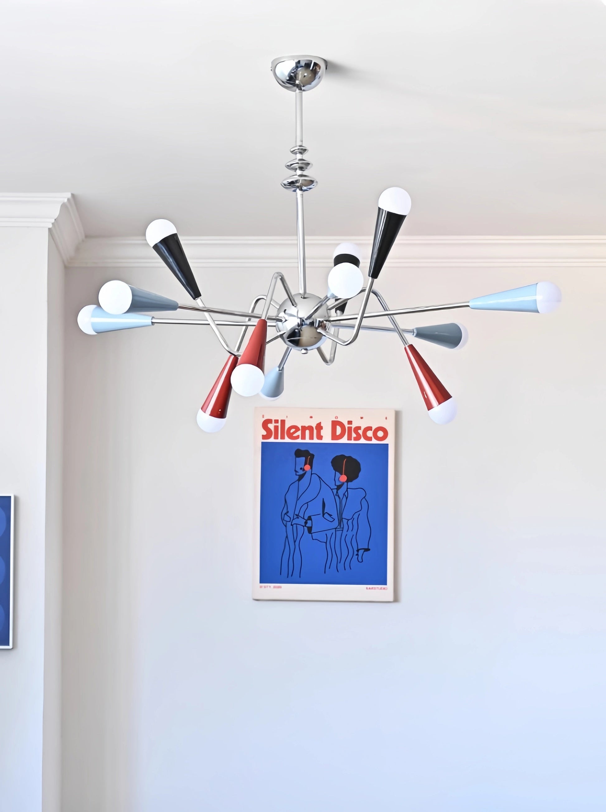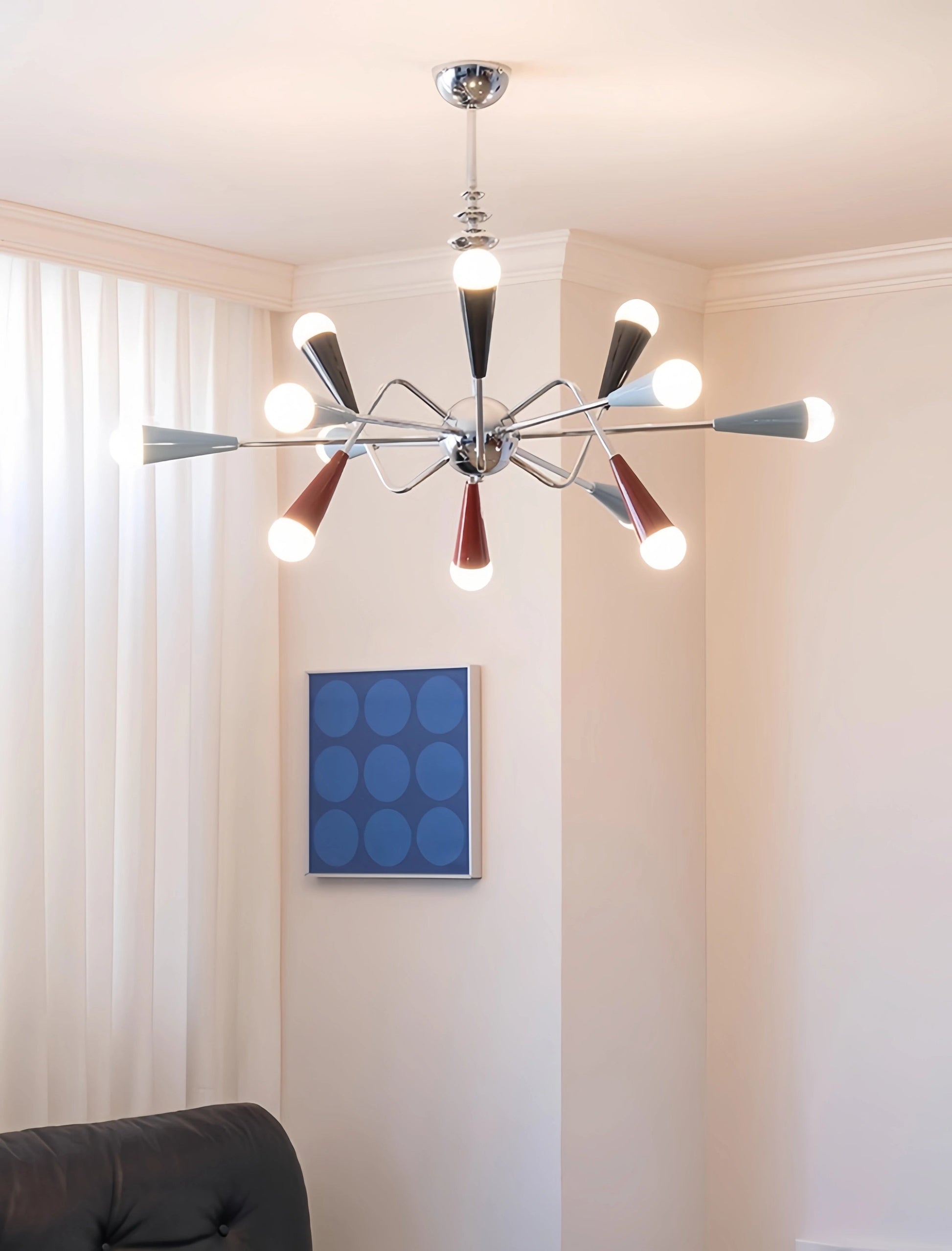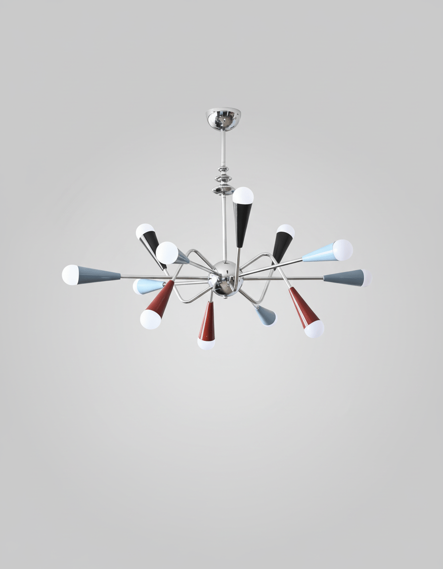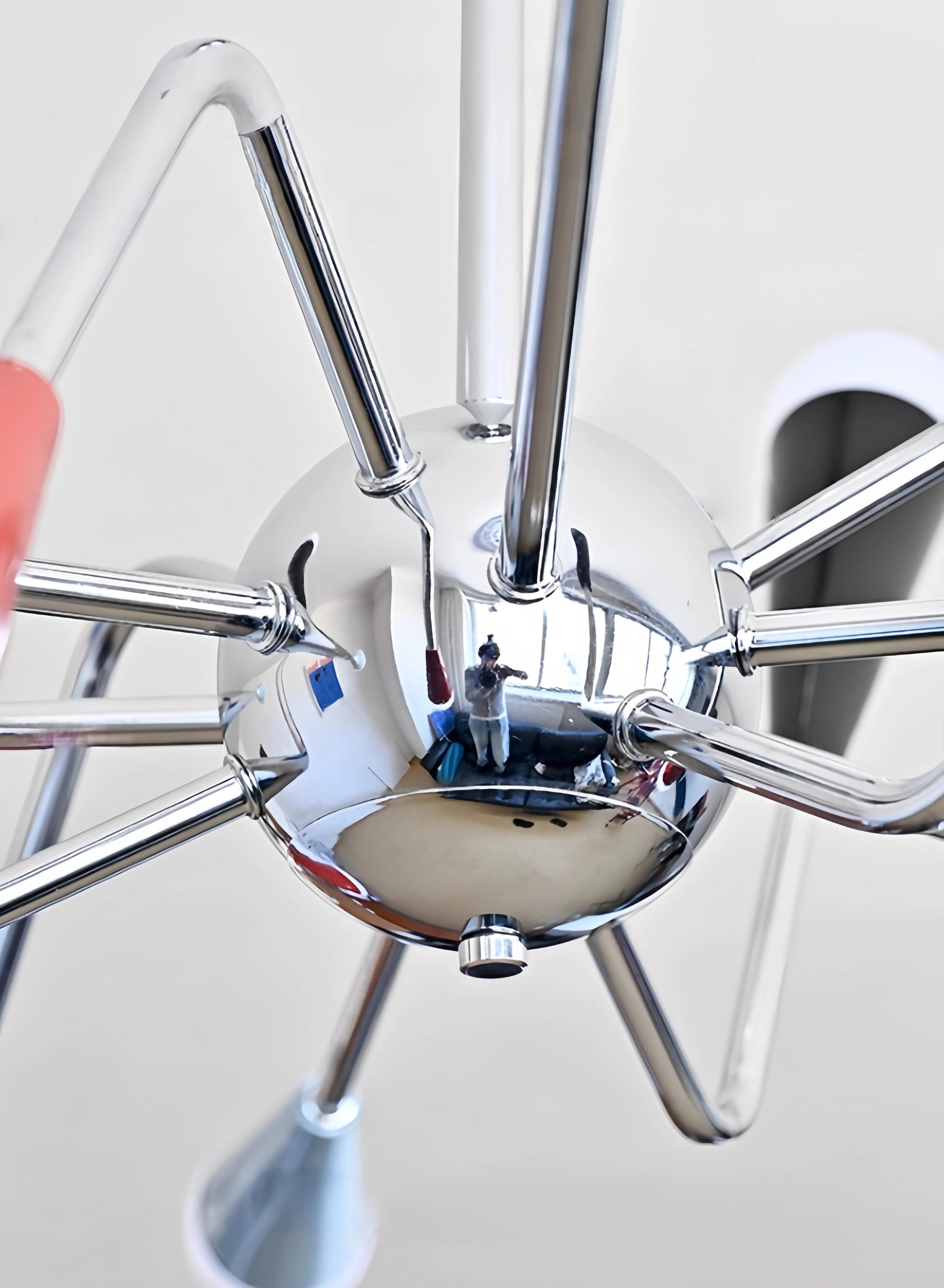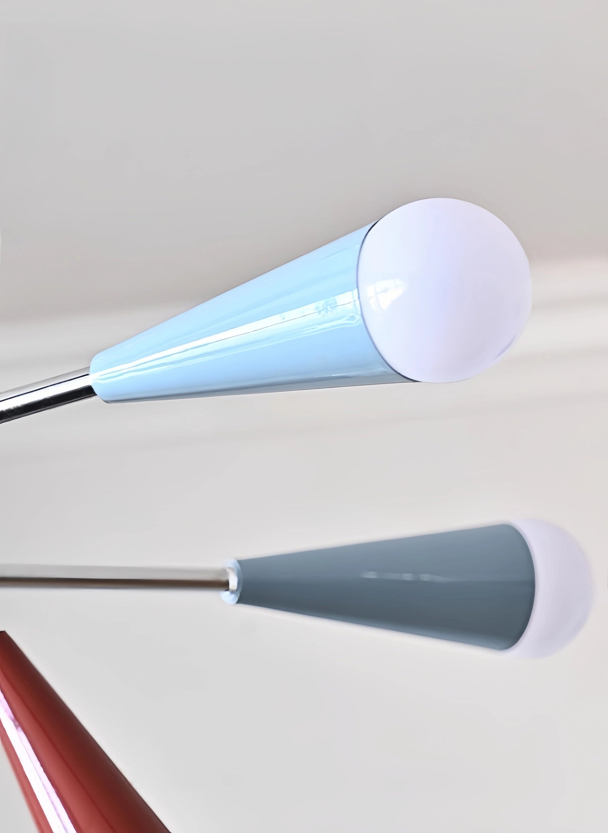Geometric lines and a functionalist, minimalist structure continue the Bauhaus philosophy. High-saturation colors clash with the conical shape of the lampshade and the spherical lamp head, creating a look that is both retro and full of modern vitality.