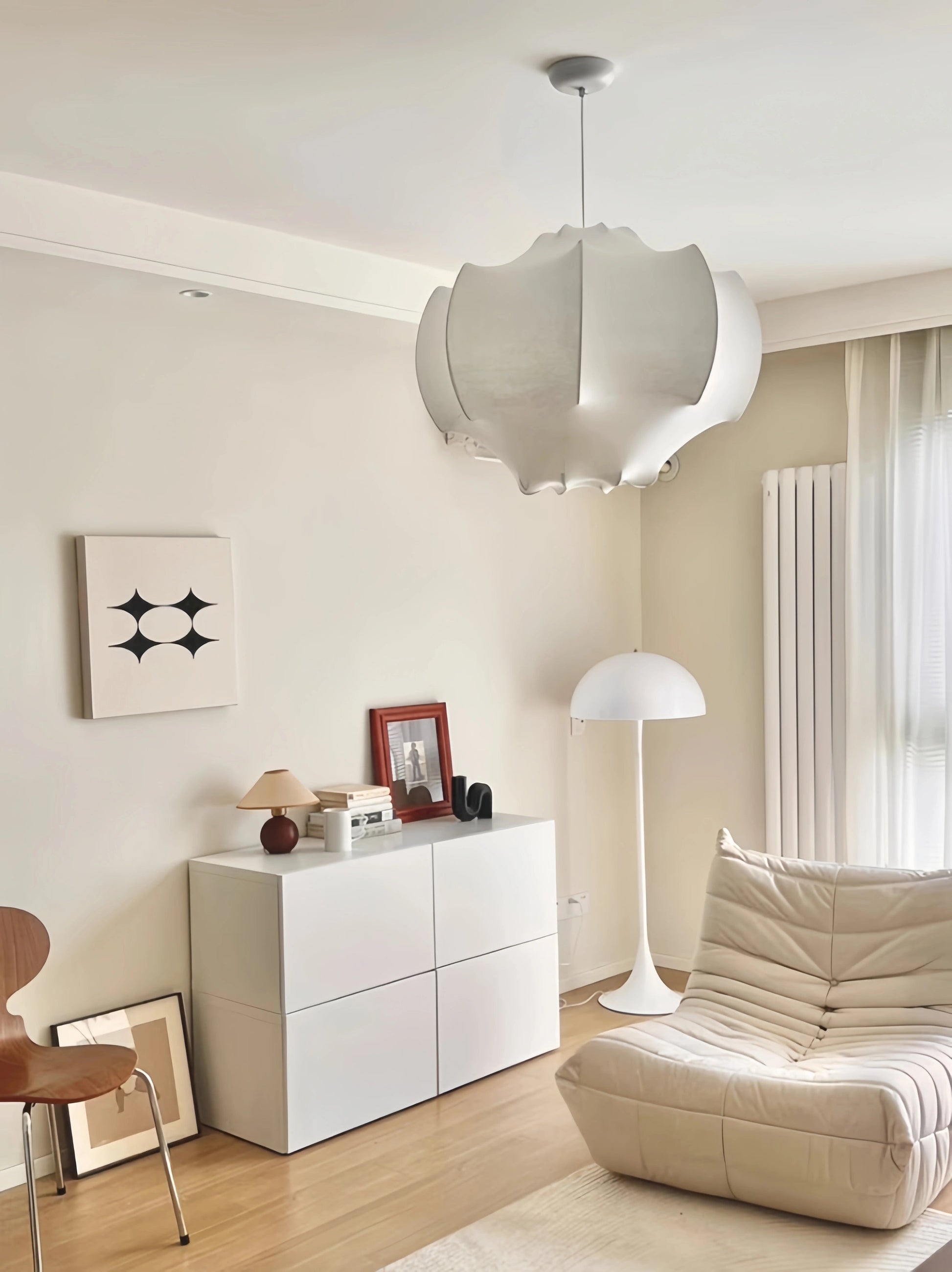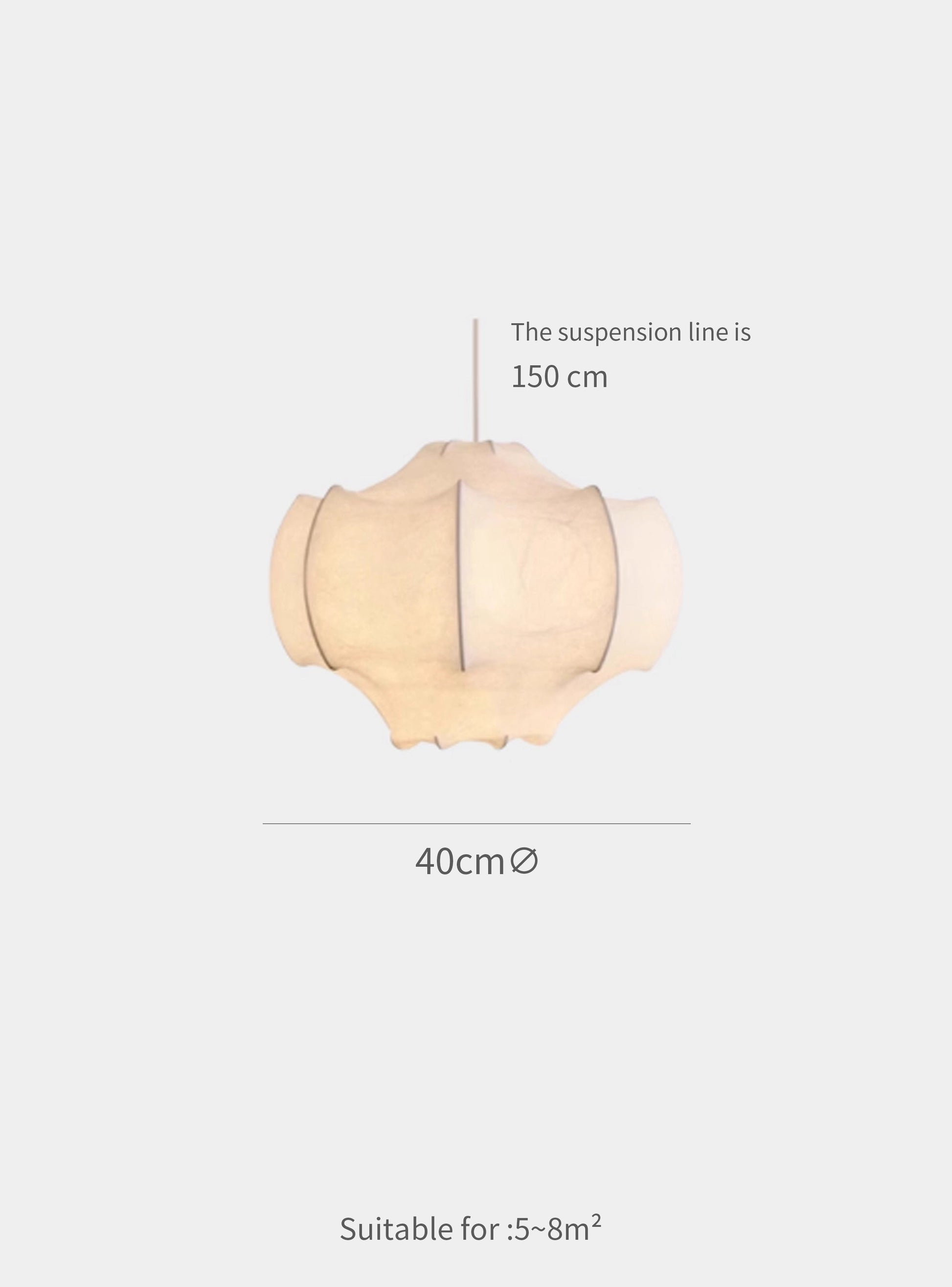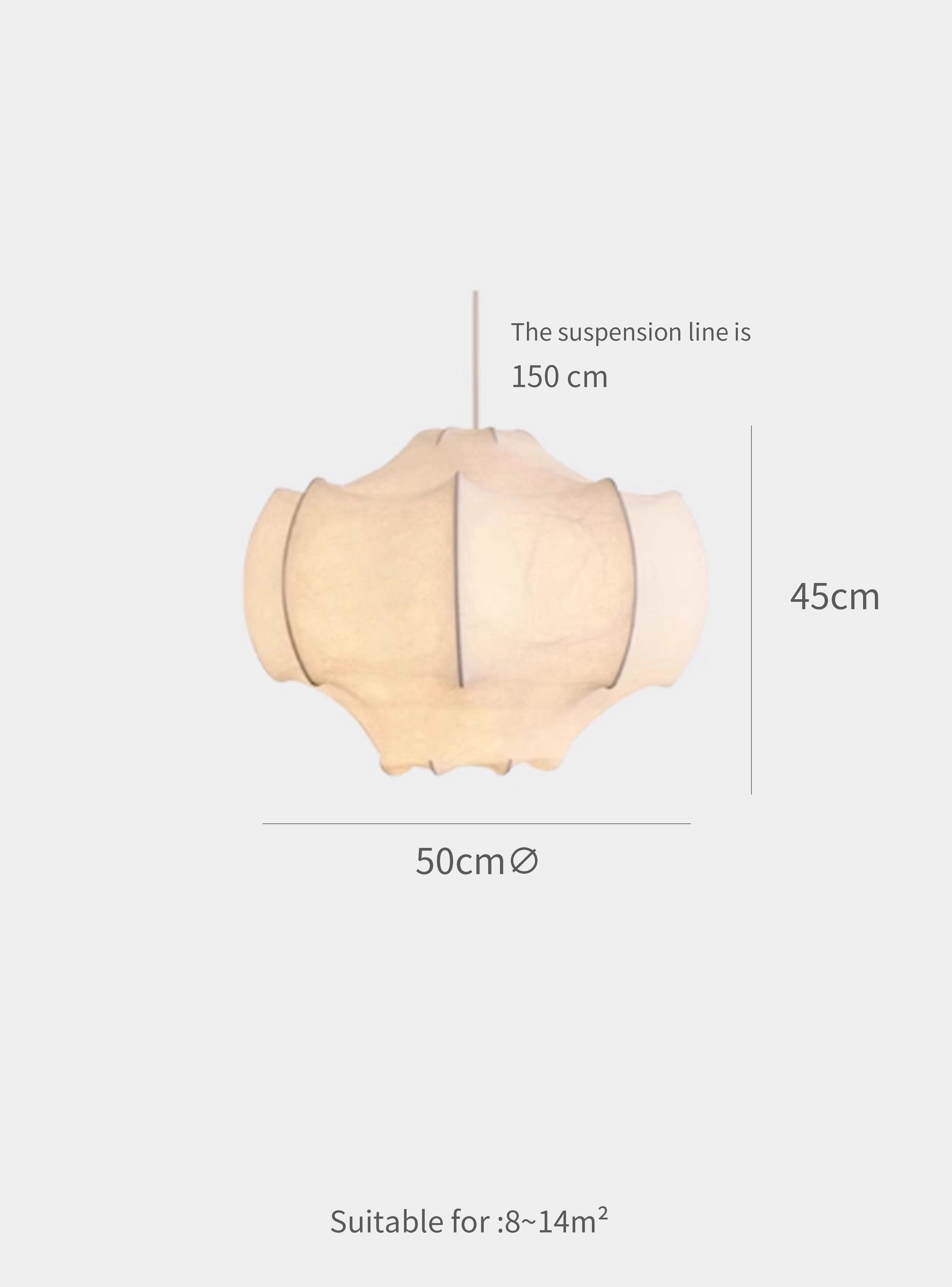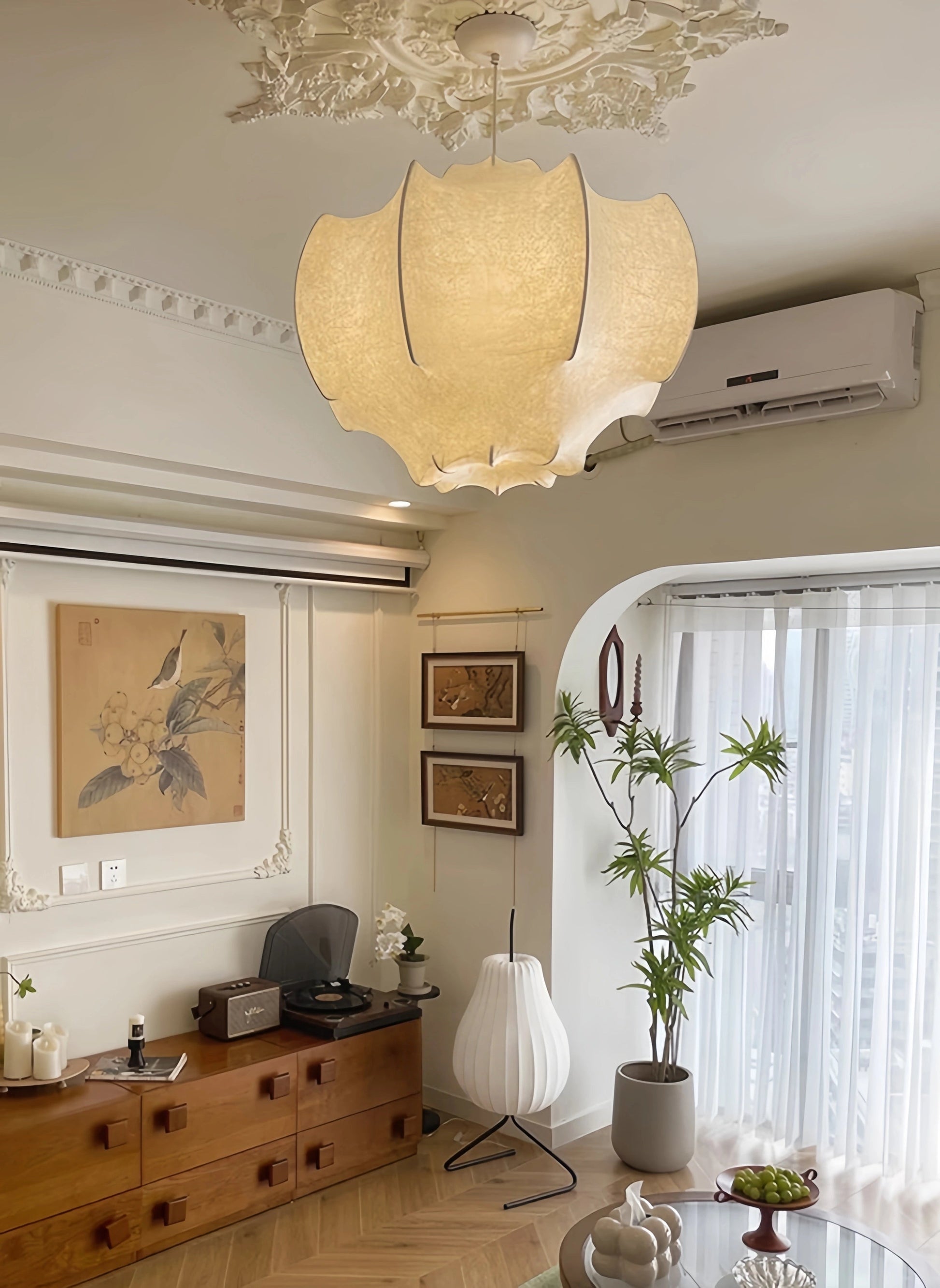 This earth-toned silk chandelier is a work of art even when the light is off. It reinterprets tradition with a modern approach, handcrafted from high-polymer materials. Its simple, lightweight design evokes an oriental aesthetic, and its voluminous, flowing form adds a touch of dynamism when hung.