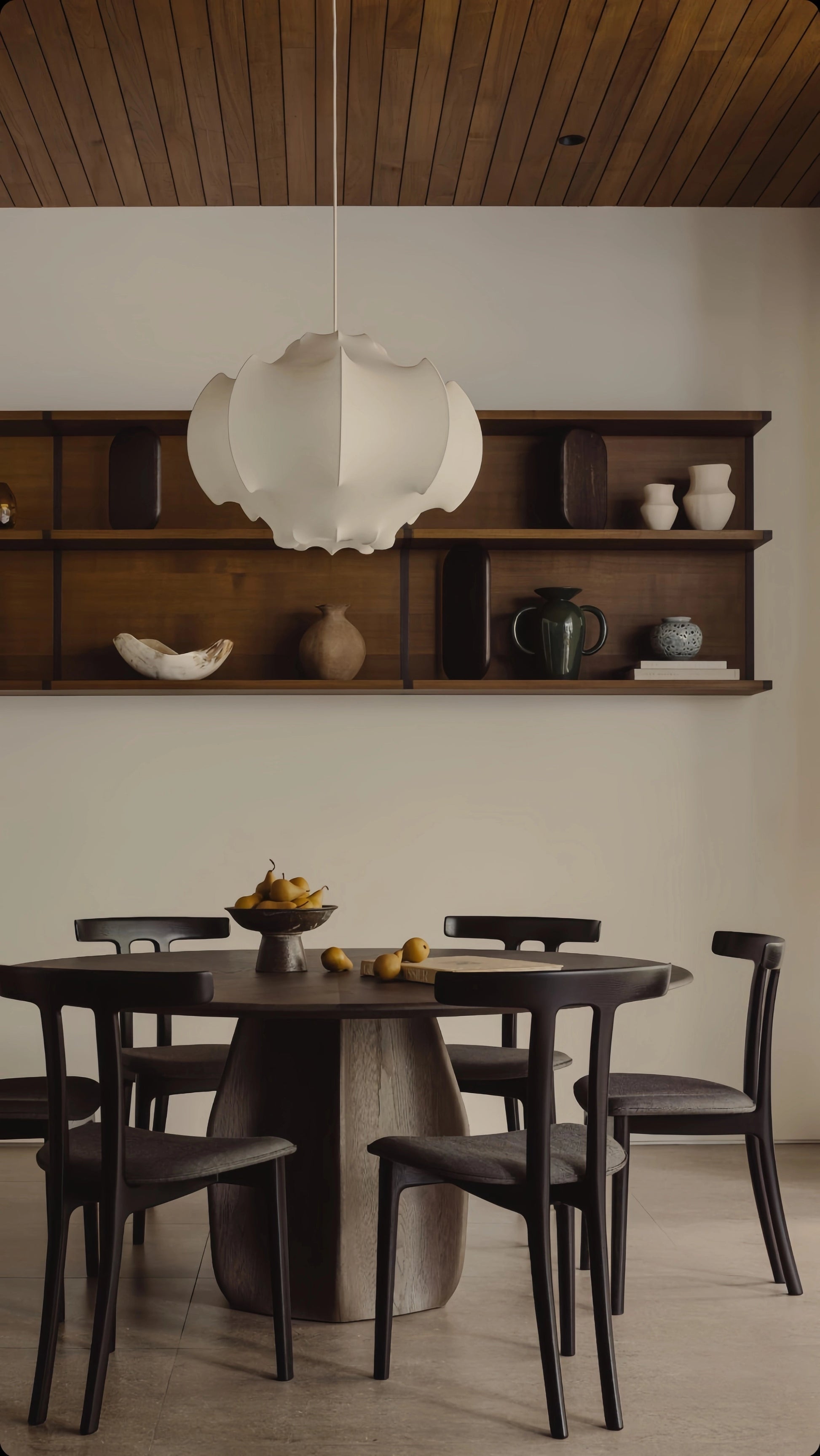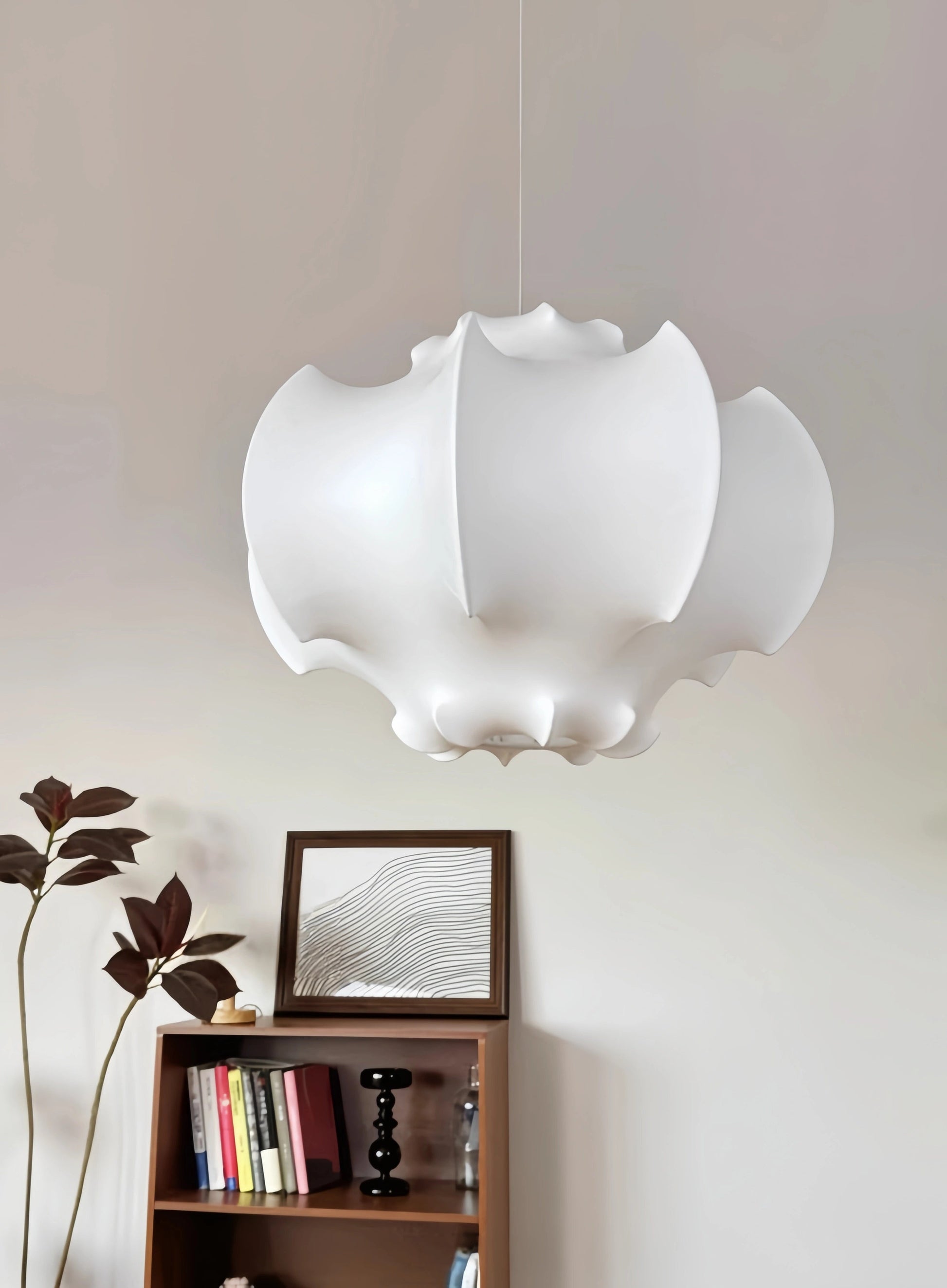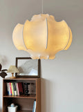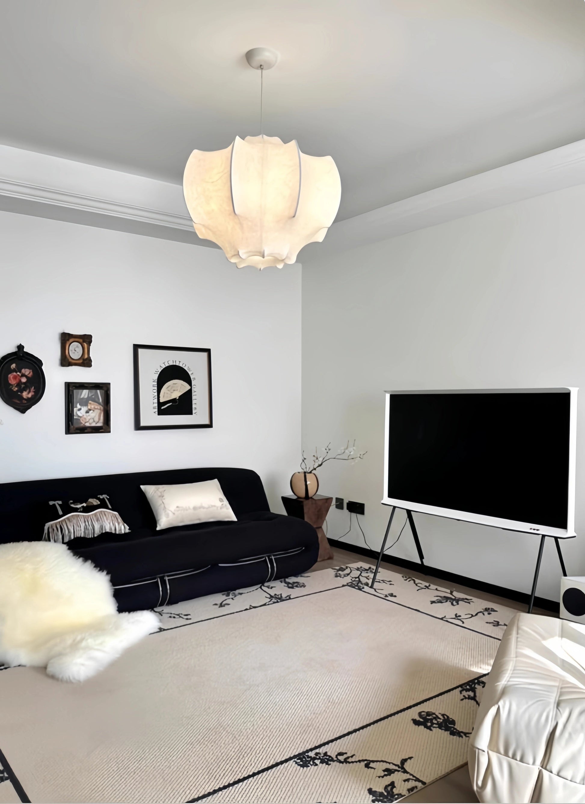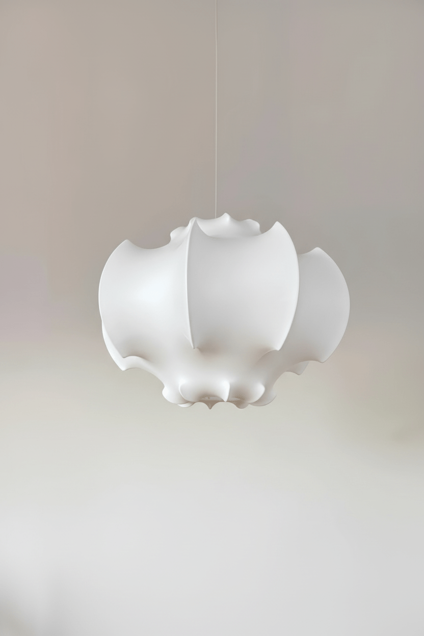 This earth-toned silk chandelier is a work of art even when the light is off. It reinterprets tradition with a modern approach, handcrafted from high-polymer materials. Its simple, lightweight design evokes an oriental aesthetic, and its voluminous, flowing form adds a touch of dynamism when hung.